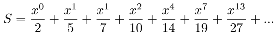 La entrada consistirá en $2$ números enteros $n$ ($1 \leq n \leq 8$) la cantidad de elementos a considerar de la sumatoria y $x$ ($1 \leq x \leq 4$) el valor a evaluar dentro de la sumatoria.