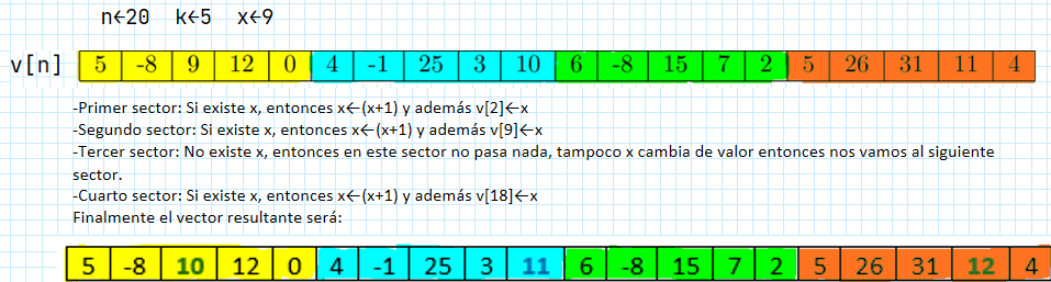 Además, tendremos un valor x el cual lo vamos a buscar en el vector para ver si es que existe en él, pero nos piden además que busquemos el elemento x por sectores tal que: